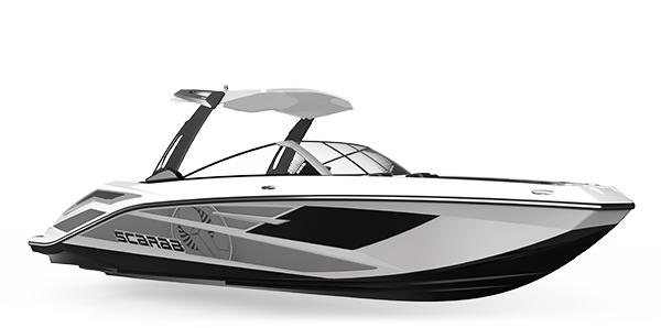 "The versatility of the center-console design makes it increasingly popular in fresh and salt water as an all-around dayboat. With available twin 300 hp Rotax jet drives, the new Scarab 235 Open ID takes the center-console to 60 mph. And the low-profile engines enable a fold-down transom tailgate with unmatched water access. "